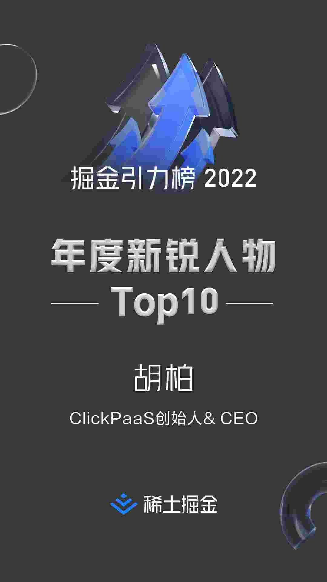 2022年1月6日,,稀土掘金社区第一届「掘金未来大会」成功举办,,会上发布了“2022 稀土掘金引力榜 年度新锐人物”榜单,,,,上海爱湃斯科技有限公司(简称沃钱包)创始人及CEO胡柏实力入选年度新锐人物TOP 10。。。。